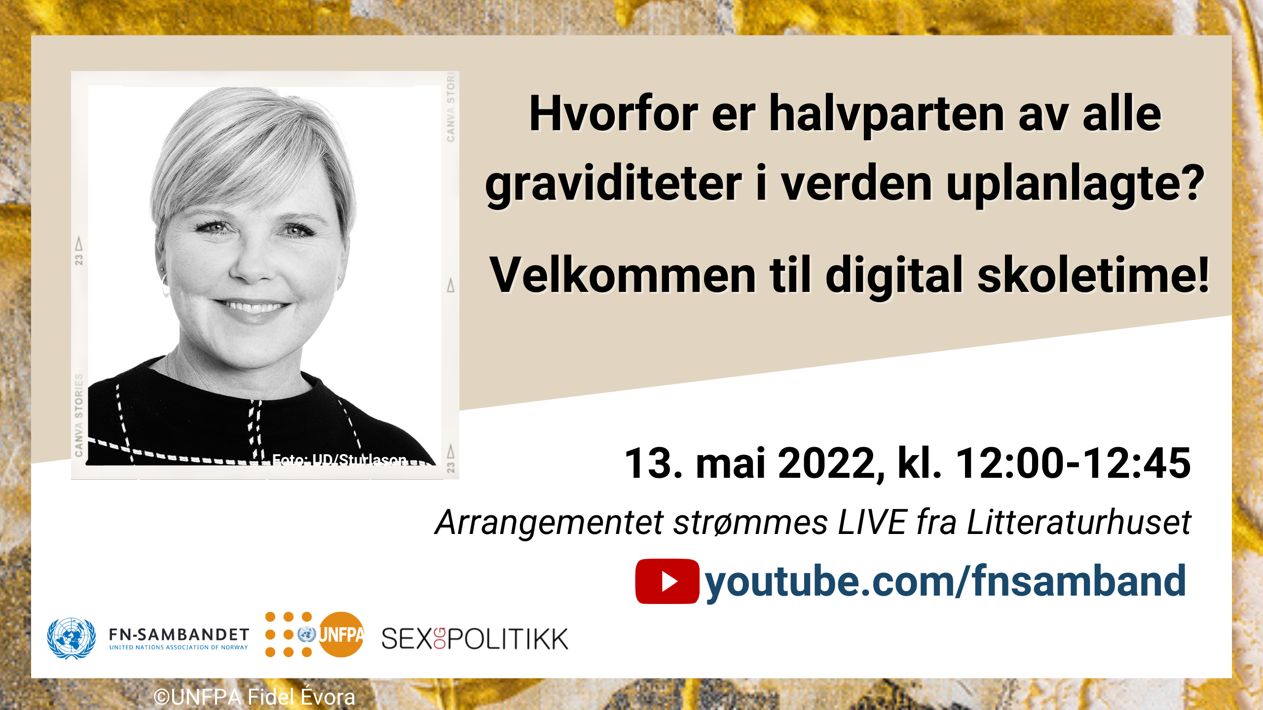 - 13. mai: Hvert år blir 121 millioner kvinner i verden uplanlagt gravide. Dette har alvorlige konsekvenser for samfunn, kvinner og jenter, global helse og bærekraftsmålene. Bli med på en samtale med utviklingsministeren om funnene i UNFPA-rapporten State of the World Population 2022. Sjekk FN-sambandet på facebook for mer informasjon.