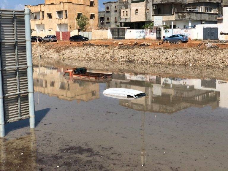 Flomvannet nådde en topp i det nordøstlige Libya søndag, med sterk vind på opptil 80 kilometer i timen, som avbrøt kommunikasjonen og falt strømtårn og trær.
