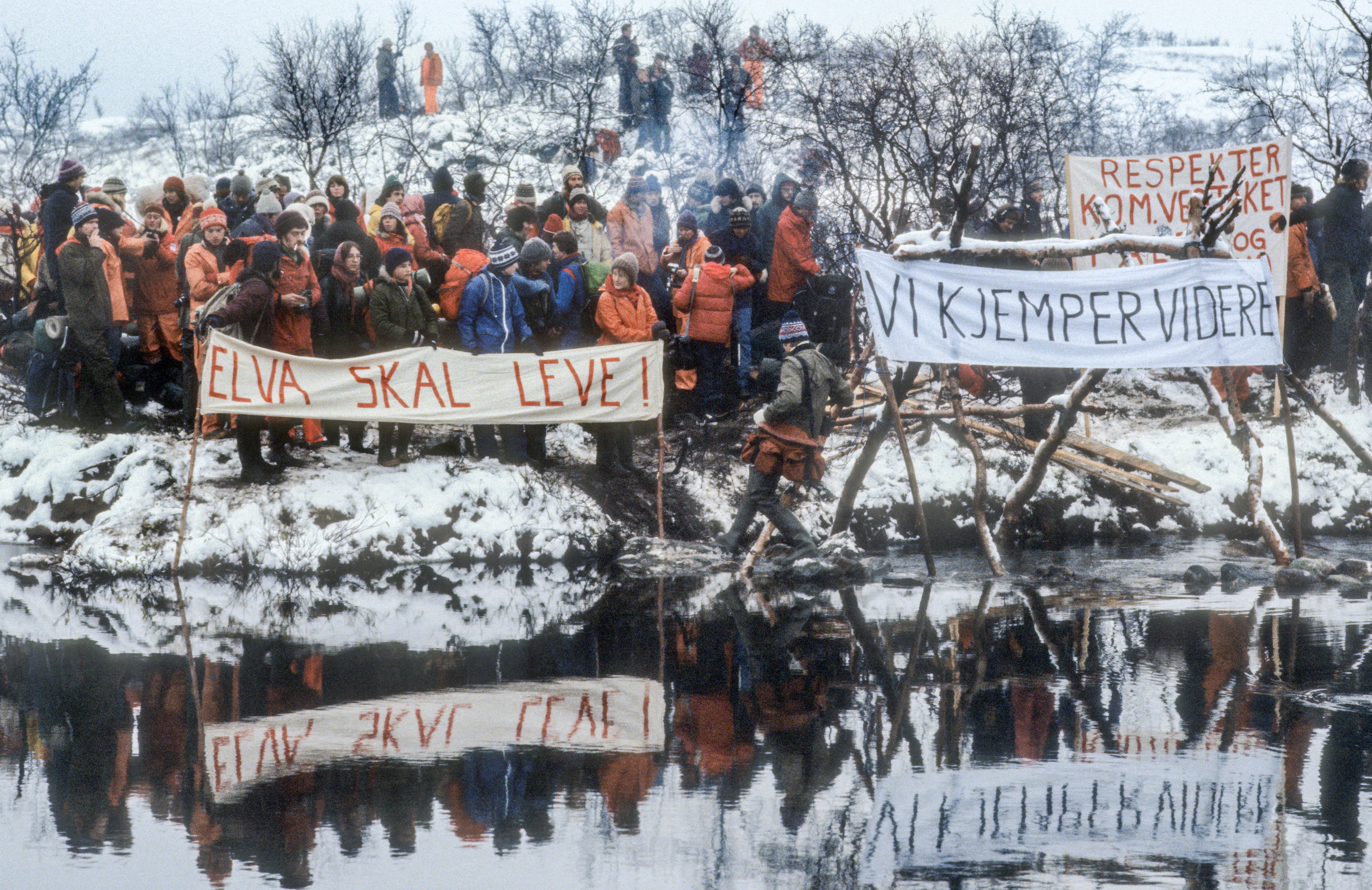 Folkeaksjonen mot utbygging av Alta-Kautokeinovassdraget i 1981. Aksjonens mål var å forhindre kraftutbygging for å bevare elva og samenes rettigheter. Naturvern tapte i konflikt med statens økonomiske interesser. Foto: Helge Sunde/Samfoto/NTB.