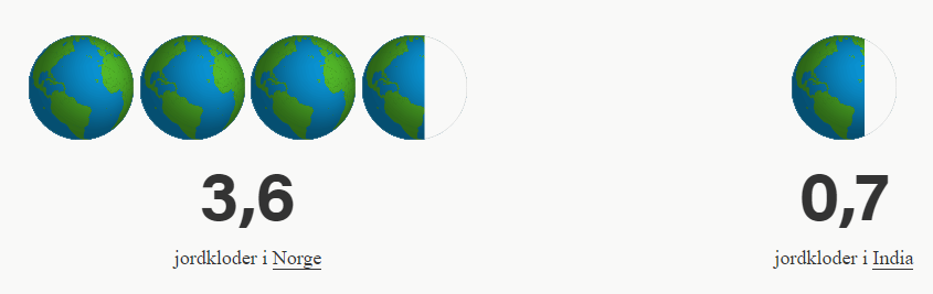 Økologisk fotavtrykk for Norge og India. Hvis alle mennesker skulle hatt samme forbruk som en gjennomsnittlig innbygger i Norge ville vi trengt 3,6 jordkloder. Til sammenligning er dette tallet 0,7 for India.