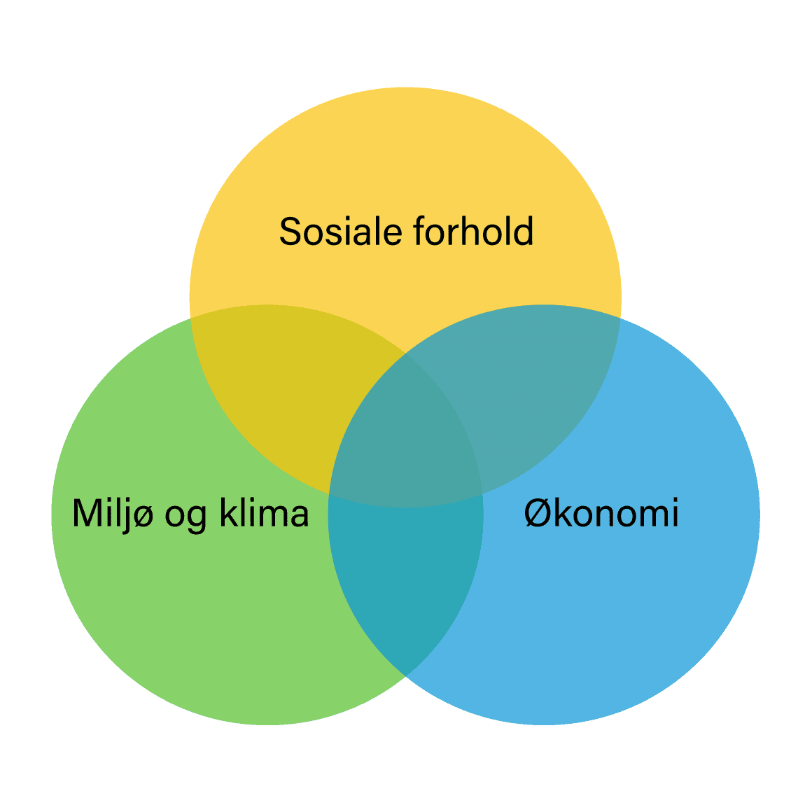 Bærekraftig utvikling består av tre dimensjoner: økonomi, miljø og sosiale forhold.