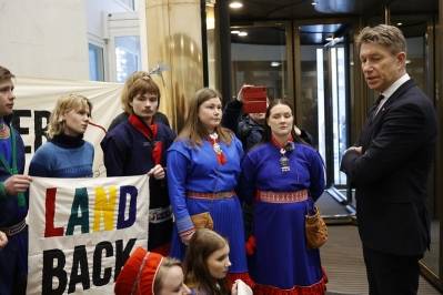 Aksjonister fra NSR-Nuorat og Natur og ungdom i konfrontasjon med olje- og energiminister Terje Aasland (Ap). Foto: Rasmus Berg / https://www.flickr.com/photos/naturogungdom/