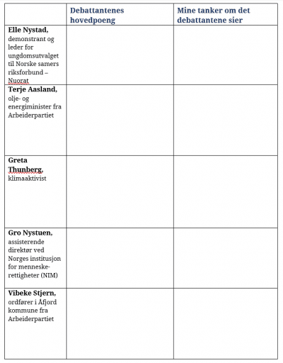I leserinnlegget skal du henvende deg direkte til den parten i konflikten som du er uenig med; enten olje og energiminister, Terje Aasland (som representerer norske myndigheter), eller aksjonistene (som ønsker å få vindmøllene på Fosen-halvøya fjernet). Det skal komme tydelig fram hva din mening om saken er. Du bør bruke de vedlagte kildene om Fosen-saken og FNs beskyttelse av urfolks rettigheter i din argumentasjon. Avslutt leserinnlegget med en tydelig oppfordring til mottakeren.
